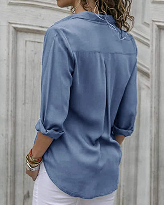 Wholesale Women's Long Sleeve V-Neck Stripes Casual Blouses Pocket Button Down Shirt Tops