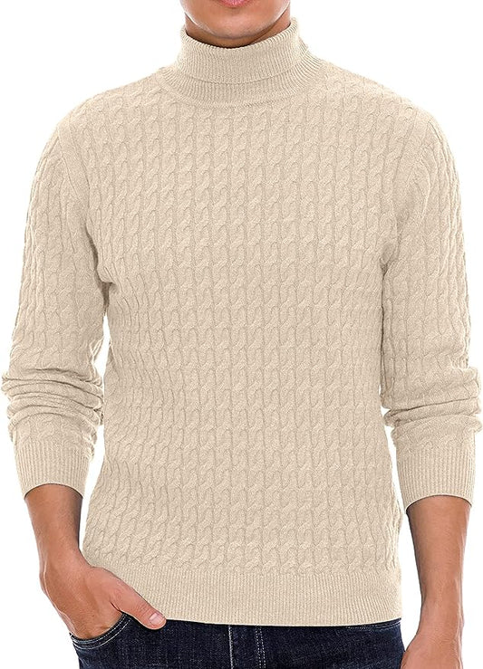 Men's Twisted Knitted Turtleneck Sweater Casual Soft Pullover Sweaters - Beige