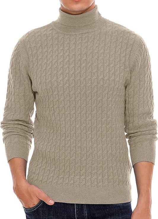 Men's Twisted Knitted Turtleneck Sweater Casual Soft Pullover Sweaters - Khaki