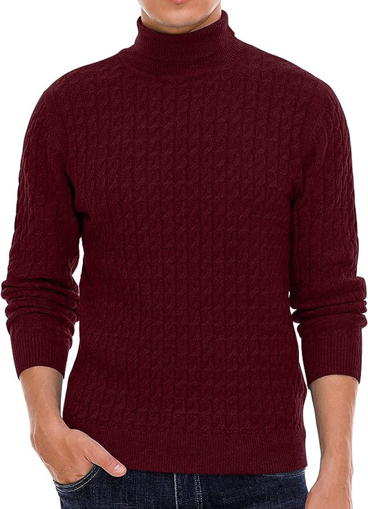 Men's Twisted Knitted Turtleneck Sweater Casual Soft Pullover Sweaters - Wine Red