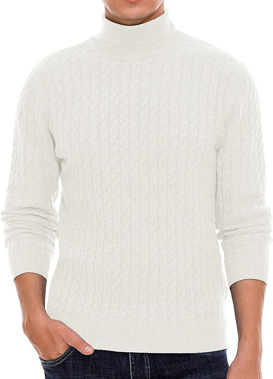 Men's Twisted Knitted Turtleneck Sweater Casual Soft Pullover Sweaters - White